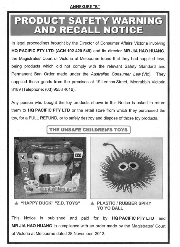 PRODUCT SAFETY - IMPORTANT NOTICE ORDERED BY MAGISTRATES' COURT OF VICTORIA (Click Here)